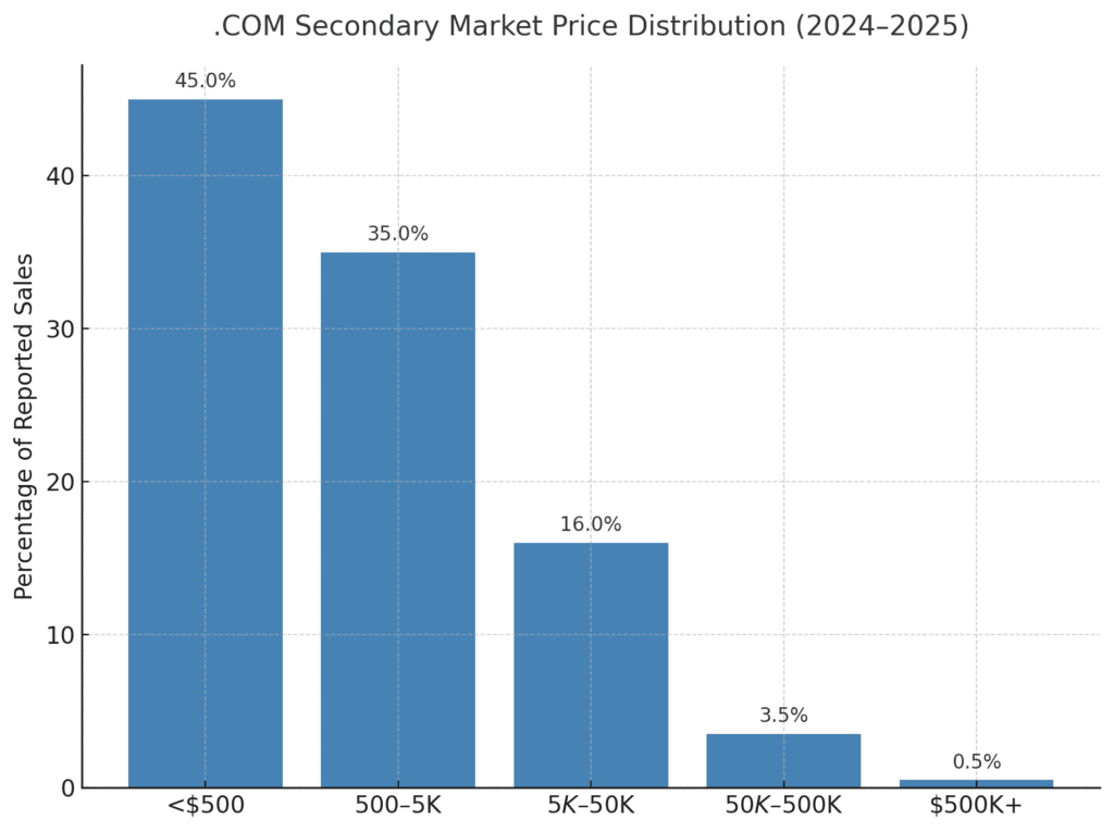 • Under $500: The largest share of transactions — often investor flips, geo-domains, and long-tail brandables.