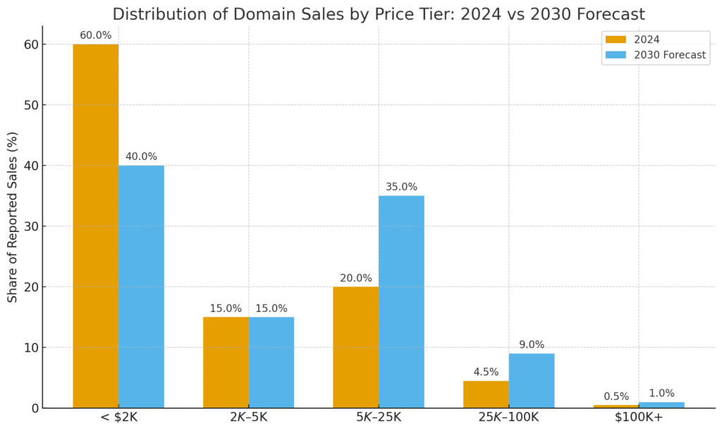 Historically, most domain sales cluster under $5,000, with a long tail of high-value sales above $50,000. This “power law” distribution will remain, but the balance is shifting upward.