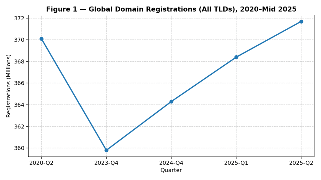 That scarcity is visible in buyer behavior: an SMB may accept a longer name in the ccTLD of its home market, but when product scope crosses borders, .com absorption resumes. The DNS data show consistent, modest growth in the underlying system—359.8M (Q4 2023) → 364.3M (Q4 2024) → 368.4M (Q1 2025) → 371.7M (Q2 2025)—but scarcity is not about totals; it’s about the subset of names that can carry a category. Verisign Blog+3Verisign Blog+3Domain Name Industry Brief (DNIB)+3