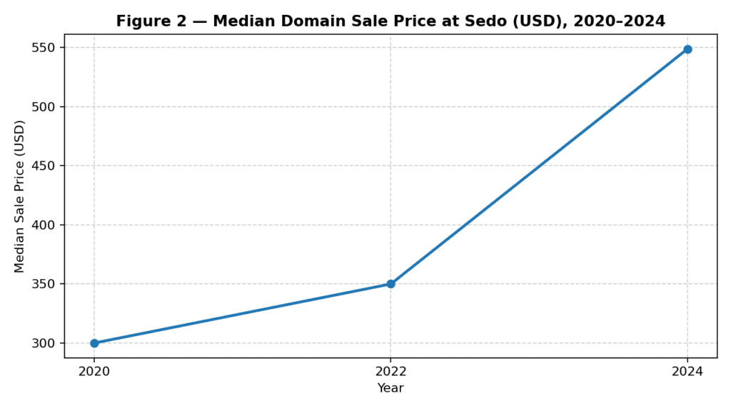 1. Spread compression for mid-tier inventory. As comps become transparent, mid-market names (say $2k–$15k) will converge around tighter bands. This is already visible in reported medians: the Sedo median moved from about $300 in 2020 to $350 in 2022 and $549 in 2024, reflecting both mix and channel effects, but also broader adoption of BIN rails and data-anchored pricing. SIDN – Het bedrijf achter .nl+2Domain Name Wire | Domain Name News+2