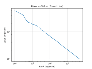 A second way to understand the market is through rank. When domain transactions are ordered from highest to lowest price, the resulting curve reveals the same underlying geometry. The highest-priced domains are extraordinarily rare, and value declines sharply as rank increases. The relationship is not linear—it follows a power-law pattern, where a small number of assets dominate the entire structure.