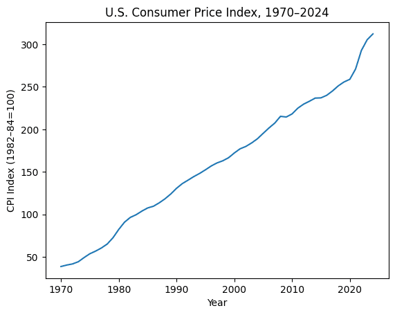 The first chart below shows the U.S. Consumer Price Index (CPI) from 1970 to 2024.