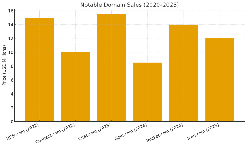 The crypto boom of 2020–2021 fueled massive demand for blockchain-related domains. Names like ETH.co, Coin.org, and numerous DeFi-related .coms sold strongly. But the 2022 crypto crash introduced volatility — speculative purchases slowed, yet the very best crypto domains held their value.